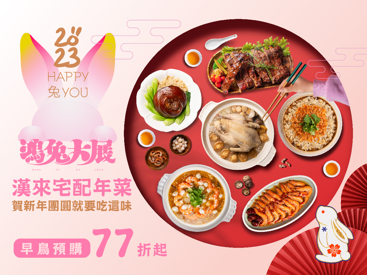 迎接兔年首次開放線上單點預訂除夕自取服務,加點、單點宅家過節都超方便,2022/12/31前不論網路還是電話訂購皆享早鳥9折優惠,現省$989!