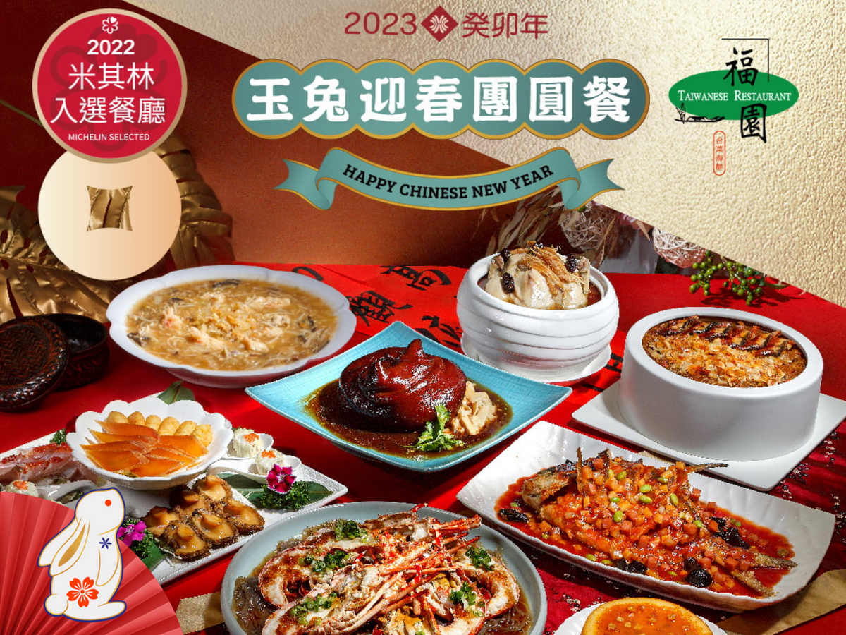 福園台菜海鮮餐廳推出之玉兔迎春除夕外帶團圓餐,6菜1湯1甜點,匯聚龍蝦、魚翅、黃金鯧、蓮貞豬蹄膀等頂級食材,每年必銷售一空,打造五星級的辦桌佳餚,除夕當日熱火現做,提供自取或是加價$400就可以提供指定地區外送服務。