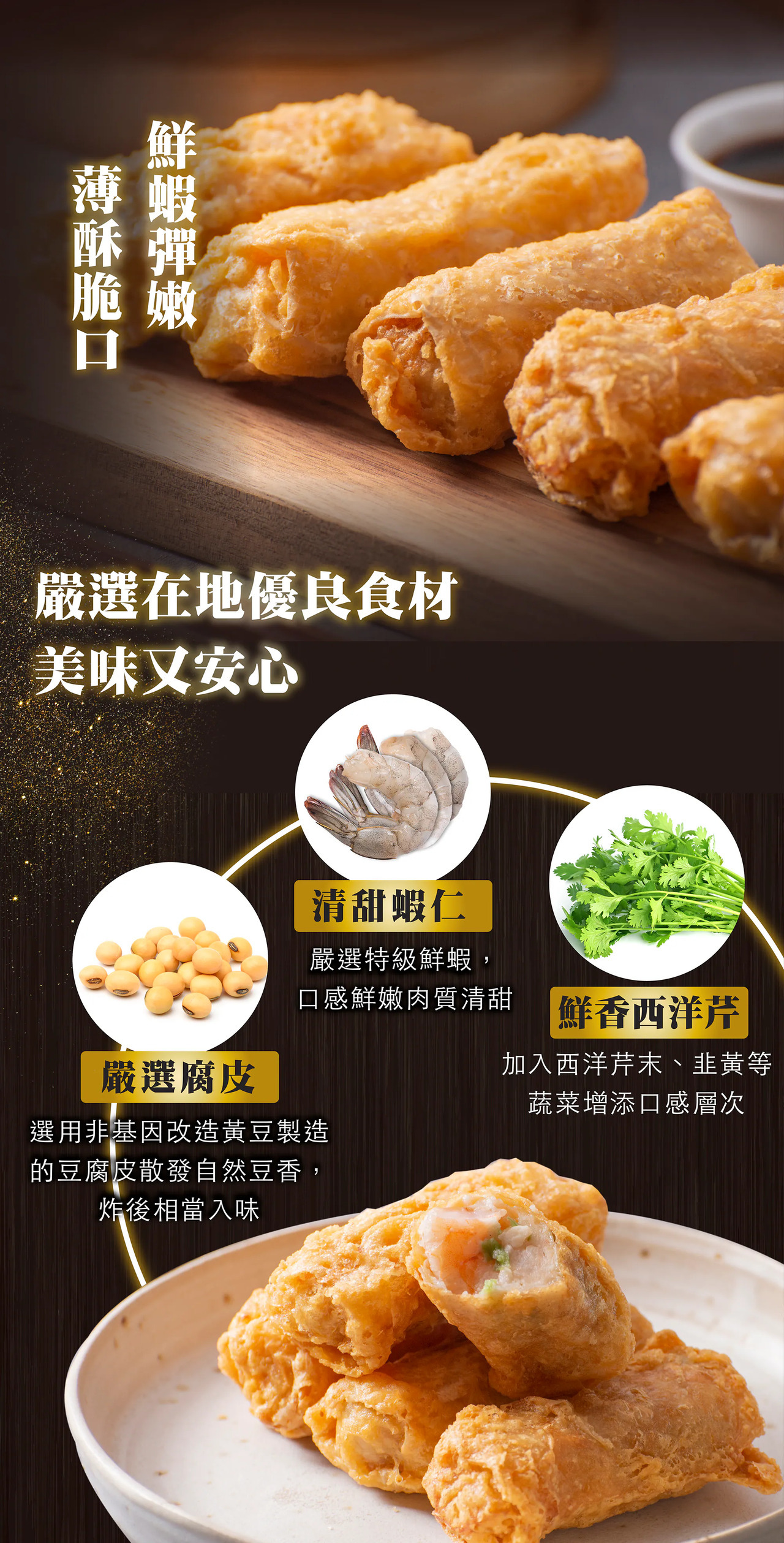 |腐皮炸至金黃薄脆包裹以新鮮魚漿、清甜蝦仁製成的內餡