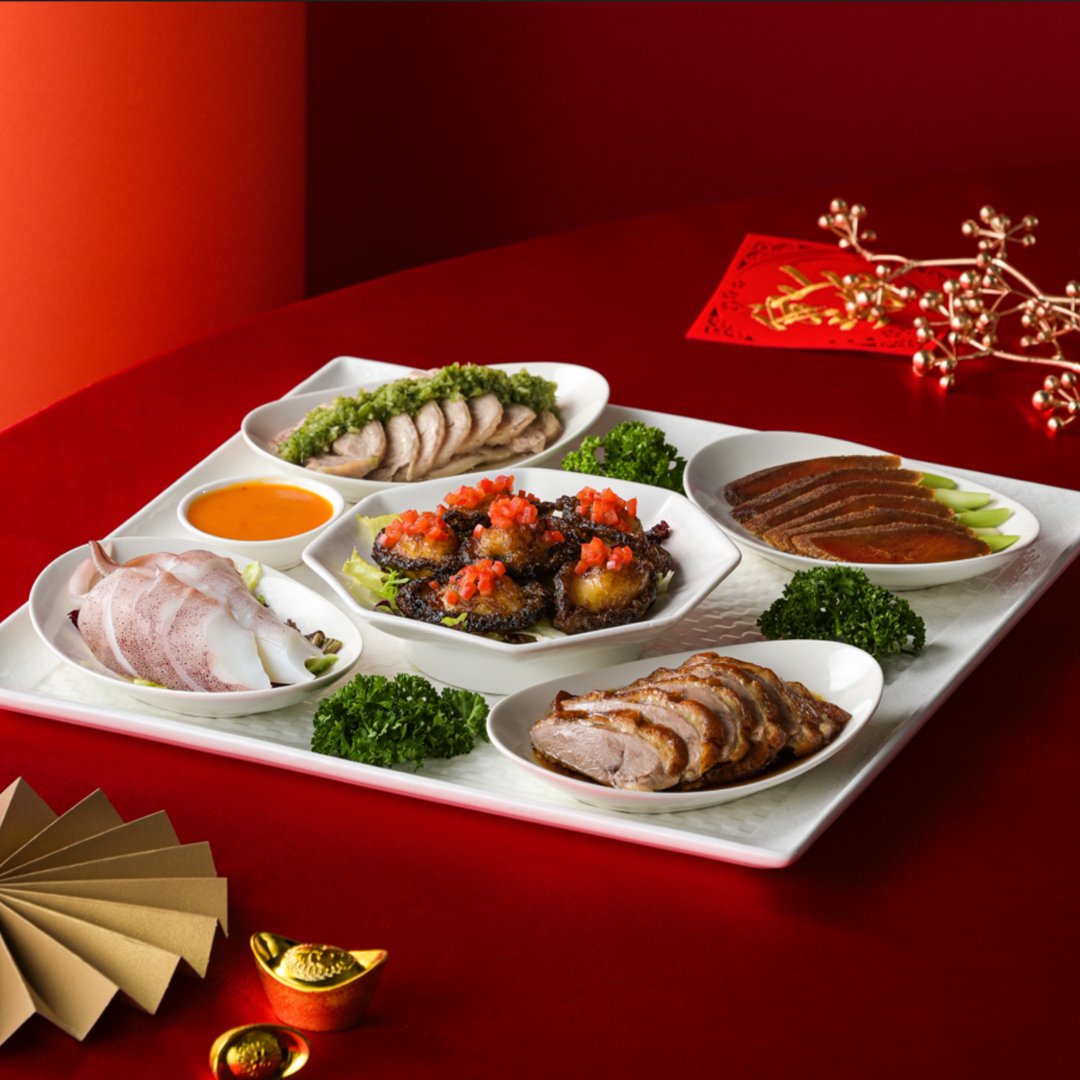 嚴選香氣濃郁厚切頂級烏魚子、Q彈的原隻鮑魚、鮮美澎湖冰捲、掛爐櫻桃鴨以及肉質及風味都極佳的土雞腿而成的五色豐富拼盤,色香味俱全,為除夕團圓大餐揭開味蕾之旅的序幕!