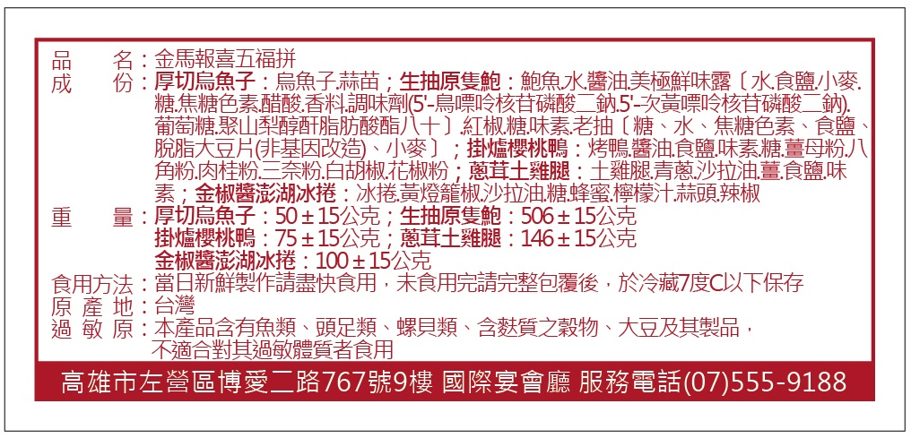 【漢來巨蛋宴會廳】金馬報喜五福拼(限高雄漢來巨蛋會館自取)