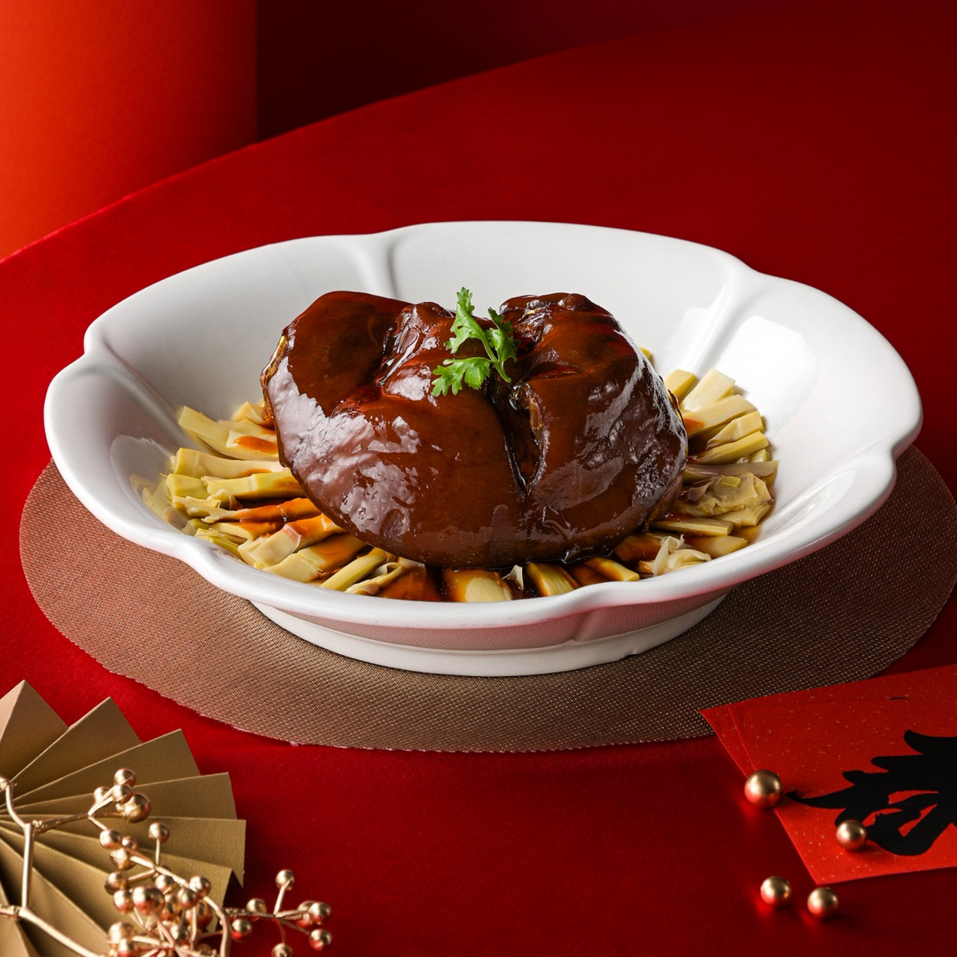 嚴選肥瘦比例恰到好處的豬蹄膀,以傳統工序細火慢燉,滷汁香氣濃郁、肉質軟糯入味。搭配爽脆竹筍襯底,鹹香之中帶出清甜層次,口感油潤而不膩。金黃飽滿的外型寓意元寶招財、富貴圓滿,是年節餐桌上最具喜氣的經典佳餚。