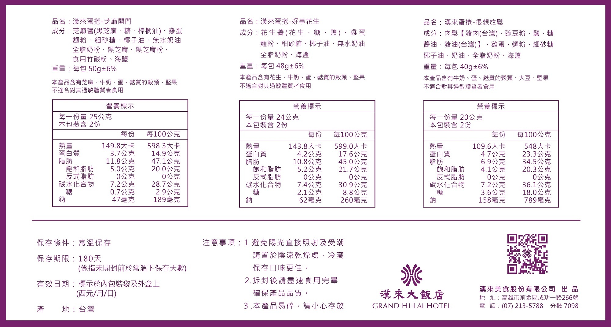❙ 商品內容:漢來蛋捲-芝麻開門、漢來蛋捲-好事花生、漢來蛋捲-很想放鬆
