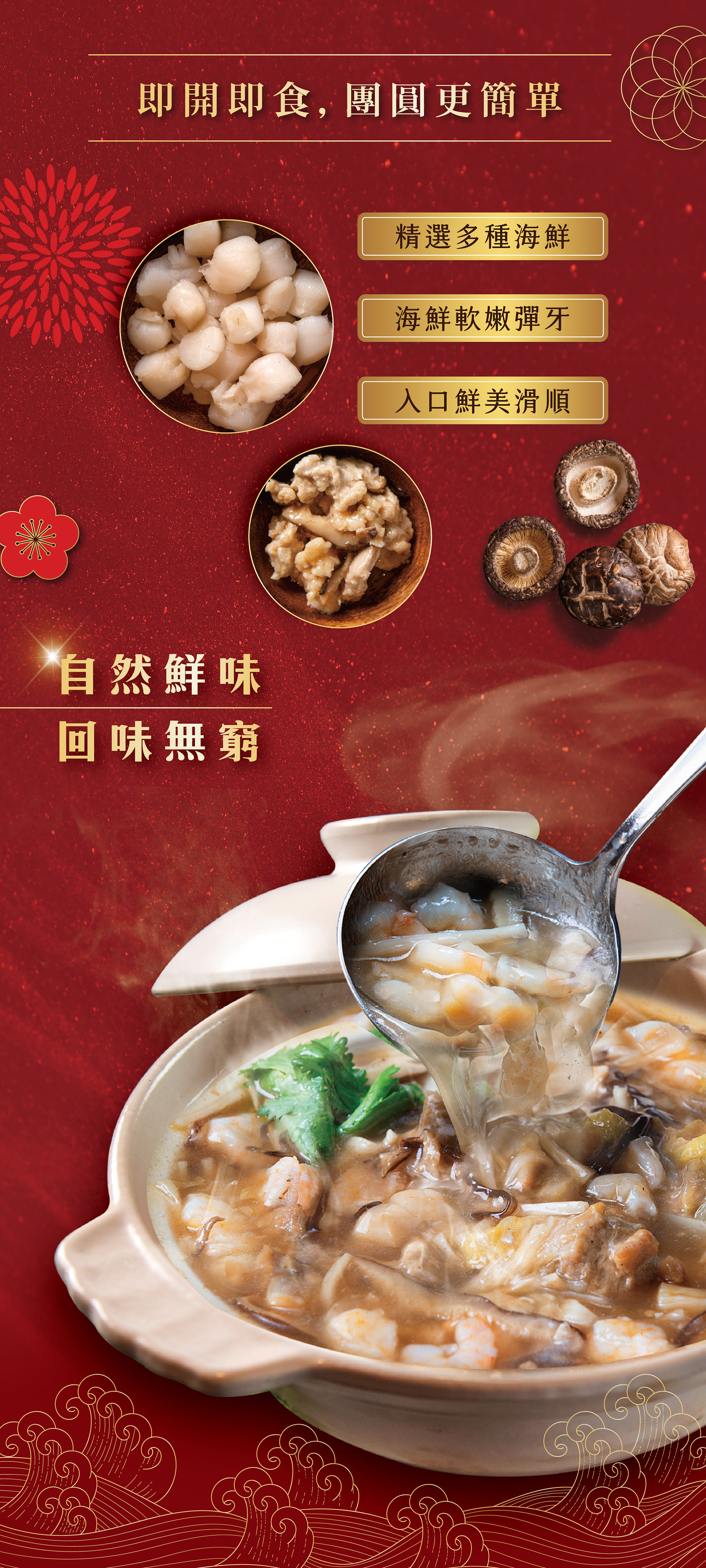 |組合商品:干貝櫻花蝦米糕、五福極品海鮮羹、貴妃藥膳醉蝦、手工霸王魚翅丸、福園古早味台式香腸、Q粉酸湯魚