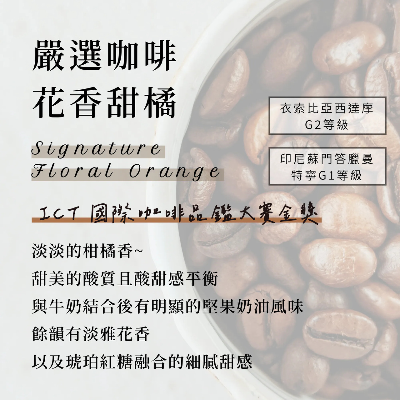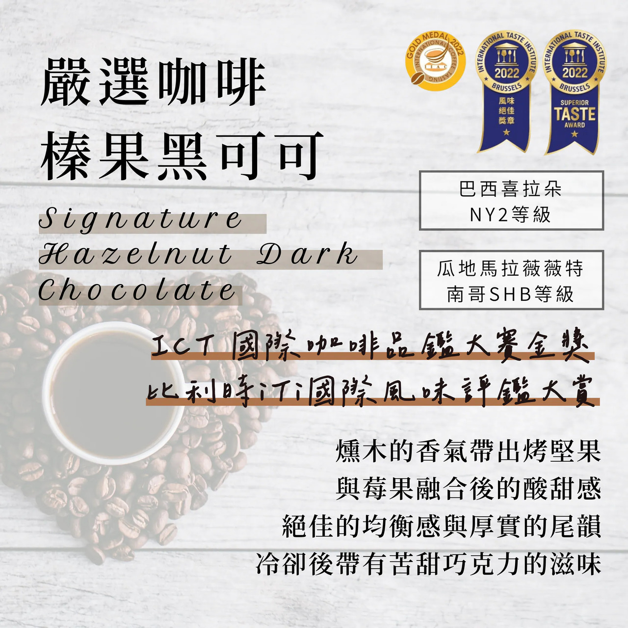 |人氣款嚴選咖啡豆榛果黑可可、花香甜橘製成