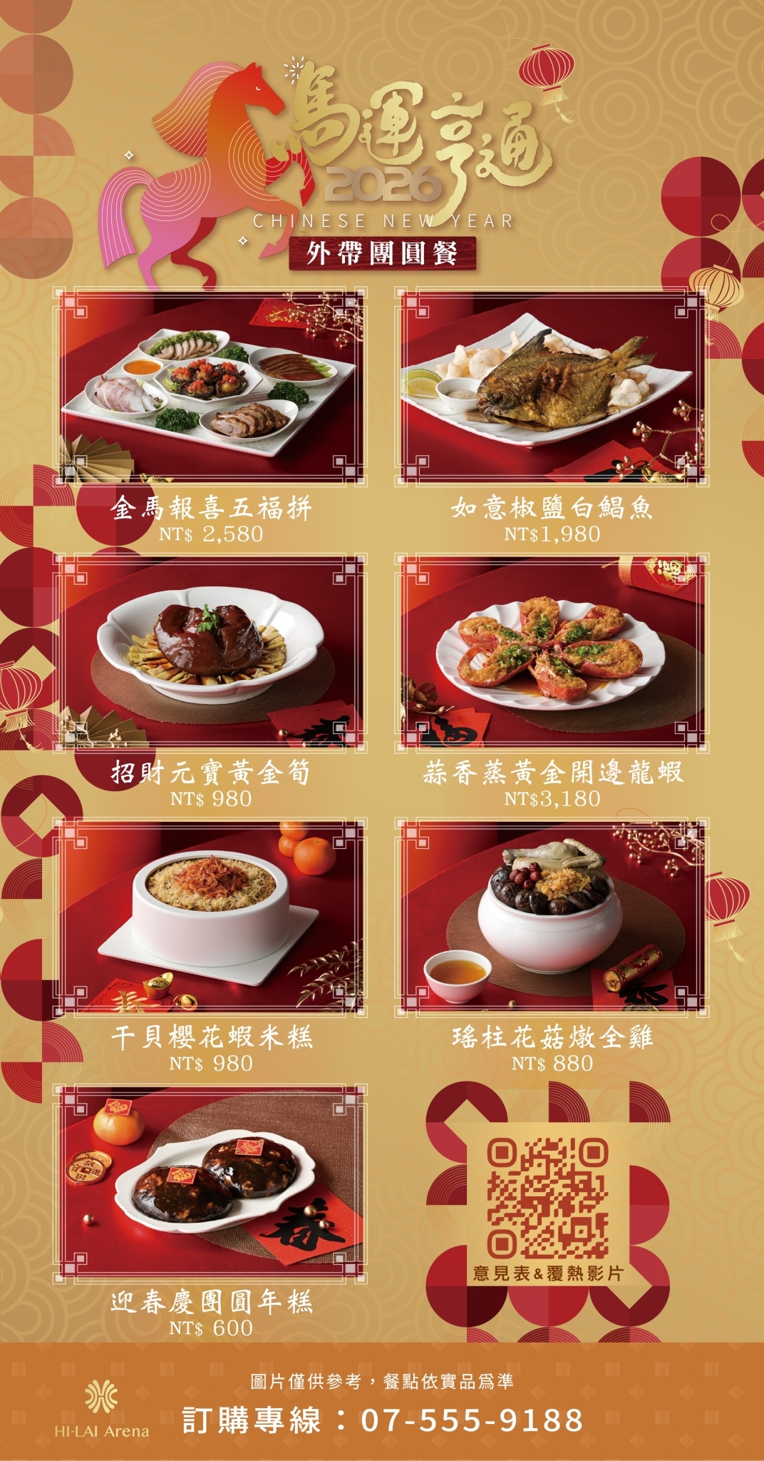 金馬報喜五福拼、蒜香蒸黃金開邊龍蝦、如意椒鹽白鯧魚、招財元寶黃金筍、干貝櫻花蝦米糕、瑤柱花菇燉全雞、迎春慶團圓年糕