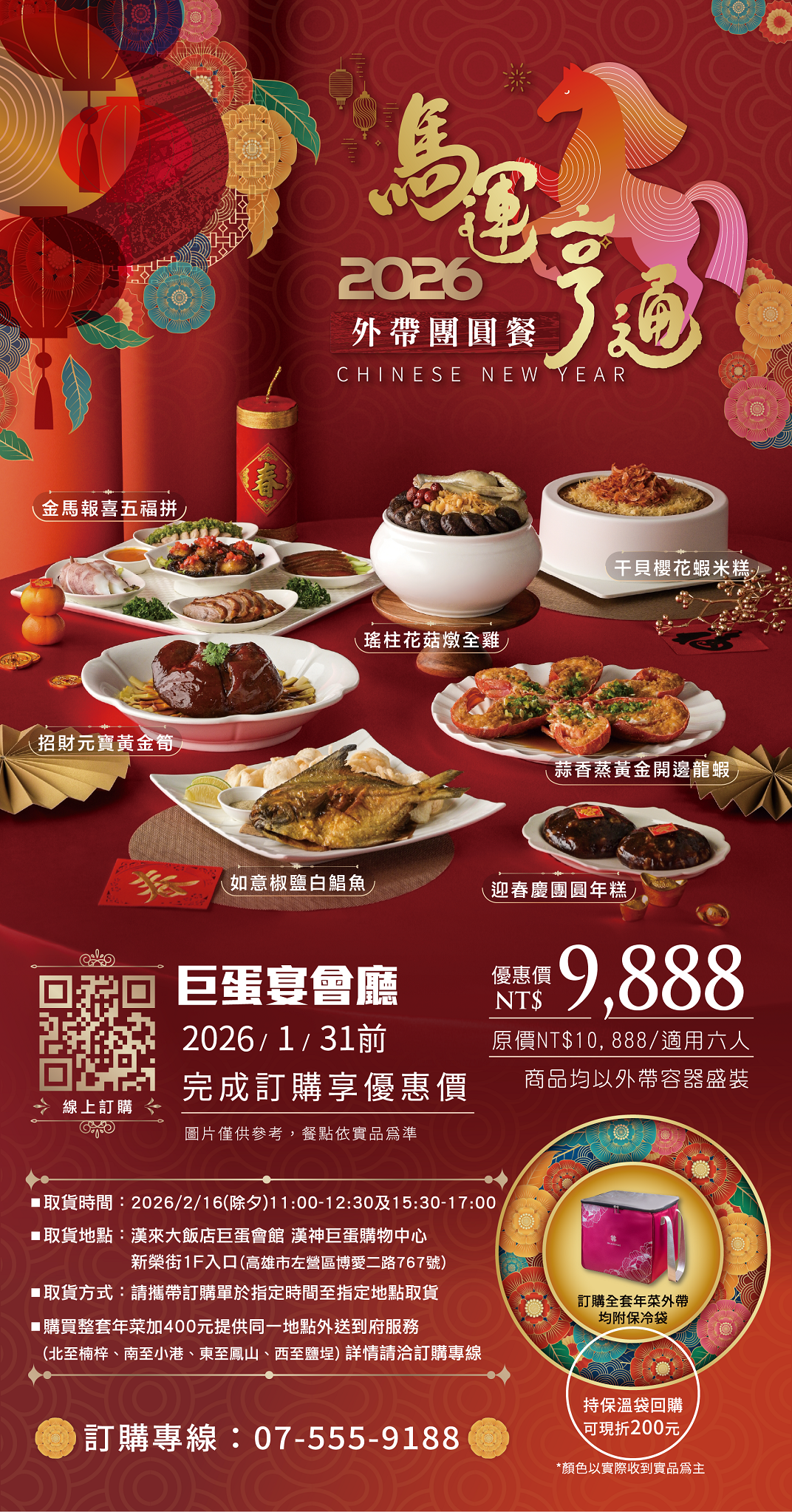 【漢來巨蛋宴會廳】2026馬運亨通除夕外帶團圓餐(限高雄指定地區外送或漢神巨蛋新榮街1F入口自取)